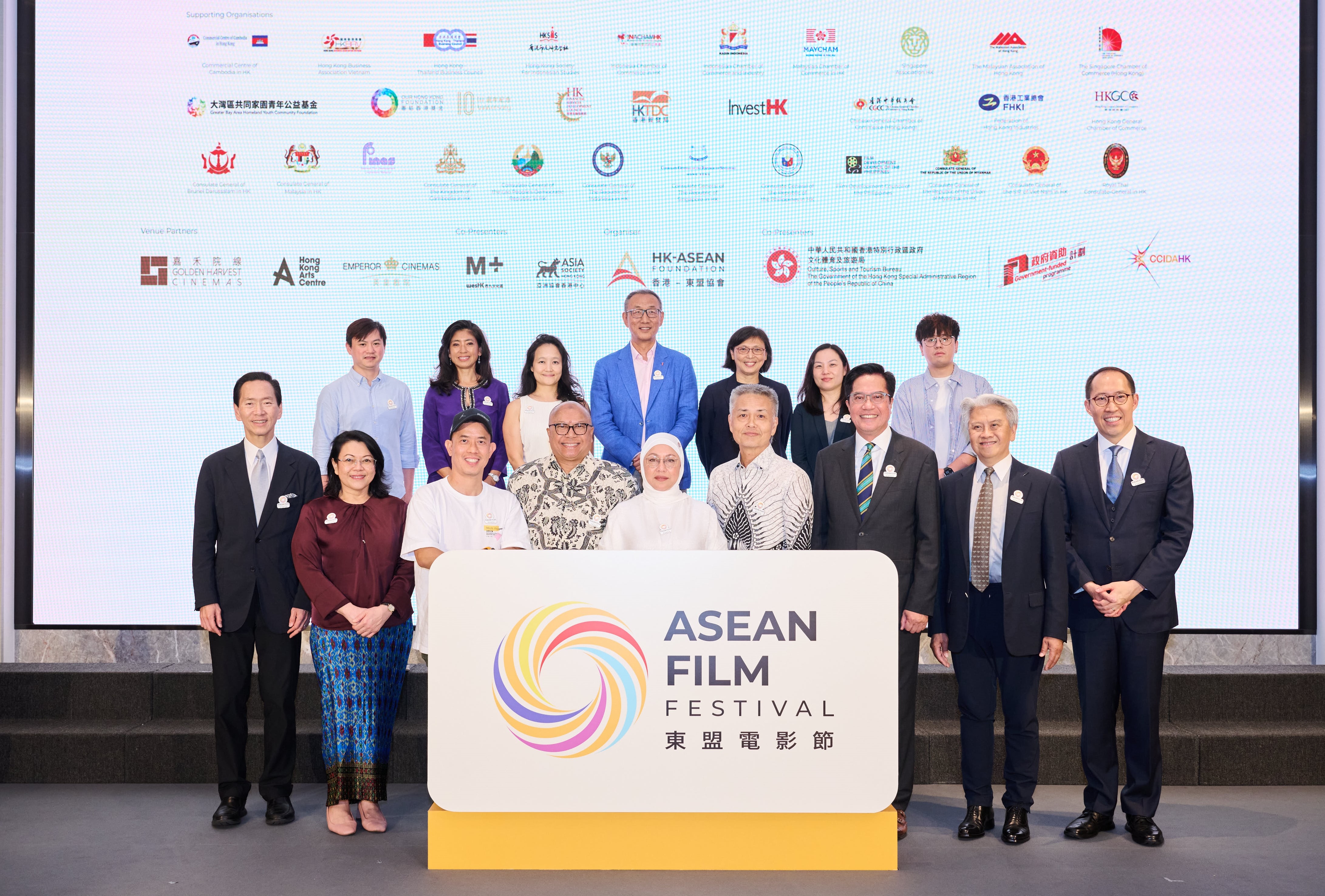 The Honourable Michael Wong Wai-lun, GBS, JP, Acting Financial Secretary of the Government of HKSAR (front row, fourth from left), Mrs Ainatol Zahayu Mohammad, Dean of the ASEAN Consuls-General and Consul-General of Brunei Darussalam in Hong Kong (front row, middle), The Honourable Bernard Charnwut Chan, GBM, GBS, JP, HK-ASEAN Foundation Advisory Council Member (front row, fourth from right) and Mr Daryl Ng Win-kong, SBS, JP, Chairman of Hong Kong-ASEAN Foundation (front row, third from left), alongside representatives from supporting organisations, who have greatly enriched the Festival’s engagement.